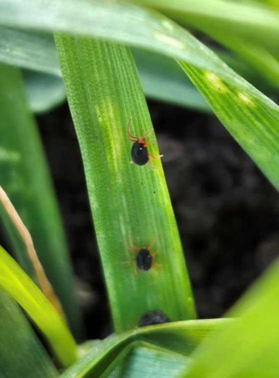 Зимний зерновой клещ — это мелкий вредитель, тело овальное до 1 мм длины темно - зеленое или почти черное, с красными ногами, с красным пятном на задней части тела. Клещ повреждает пшеницу, рожь, ячмень, злаковые травы.